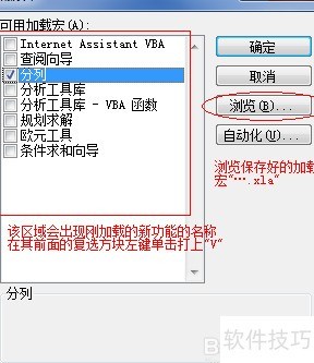 - 在弹出窗口中点击浏览,选择之前保存的加载宏文件,按图示步骤操作即可。