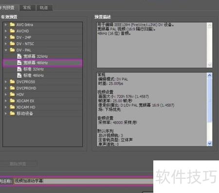 在确定后进入新建序列界面,点击有效预设中“DV-PAL”的前倒三角按钮,展开下拉菜单,从中选择宽银幕Hz,右侧将显示该选项对应的参数预览。如果你需要,也可以选择宽银幕Hz、标准Hz或标准Hz。如果没有明确的选择,可以使用视频参数检测工具来分析源视频的具体参数,并据此进行匹配选择。完成选择后,输入序列名称,最后点击确定即可完成设置。整个过程应根据项目需求灵活调整,确保序列参数与素材保持一致,以保证后期编辑的流畅性和输出质量。