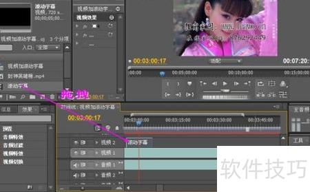 关闭字幕编辑窗口回到主操作界面,从项目面板中选中已处理完毕的字幕,并将其移动到视频的第道。之后按下空格键,在预览窗口里即时检查字幕的效果,确保其符合预期要求后再进行下一步操作。