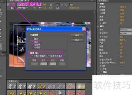 输入文字后,点击顶部滚动选项,弹窗中选择“滚动”样式并勾选开始与结束在外的选项,最后确认以完成字幕类型设定。