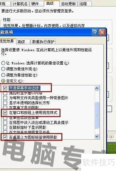 - 右键我的电脑选择属性,进入设置,点击视觉效果,按图示进行勾选即可完成配置。