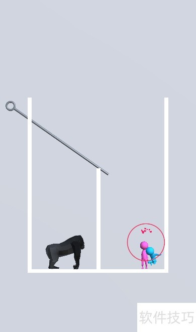 - 本关含两个斜插销,大猩猩位于粉色人左边,具体布局见图示。