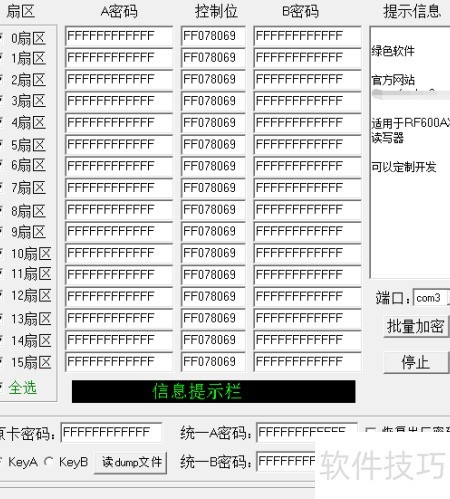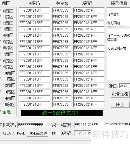 - 启动IC卡批量加密工具,按图示设定16个扇区的A、B密钥。