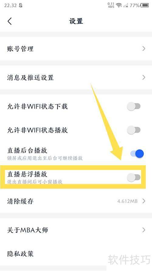 - 进入设置页面,找到直播悬浮播放并关闭。