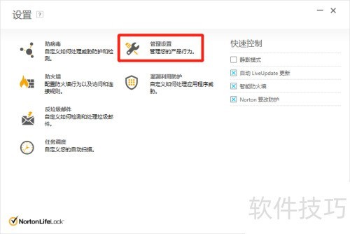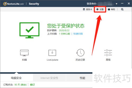 - 在Norton Security界面右上角点击设置选项。